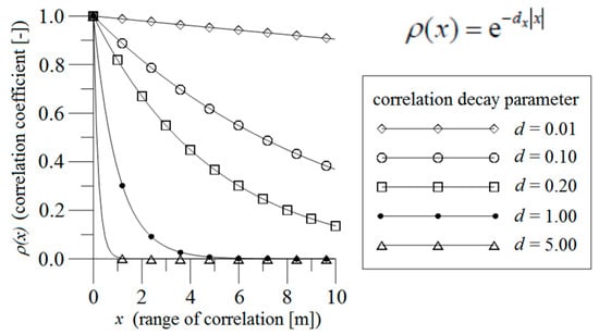The most important aspect of random field modelling is the correlation function adoption, dedicated to a given problem. Various correlation function definitions are found in the literature; usually, the function is assumed a priori. Comprehensive studies on parameter determination based on targeted research results can be found (see, e.g., [21]). Random fields of standard engineering materials (e.g., soils, concretes, composites) make use of the exponential correlation function related to the first-order autoregressive function or a Markov process model. In a three-dimensional problem case, it has the following definition [41]: