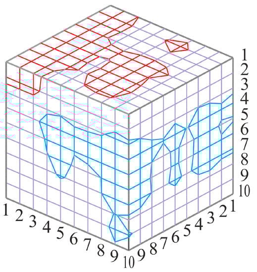 The random field applied in the FE model of the subsoil block is based on the previous truncated Gaussian variable of Young’s modulus E (, , ). A number of 200 three-dimensional Gaussian fields of points are generated, corresponding to each of the five correlation decay parameter values, directly implemented in the FE model. The number is limited to 200 samples only, as the time required to generate the fields, to create FE models incorporating these data, to conduct the numerical calculations, and to analyse the results is extremely significant. A graphical example of a generated highly correlated random field () is shown in Figure 3.