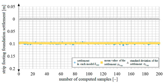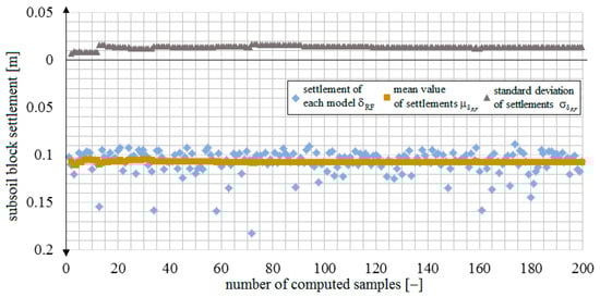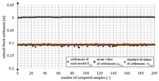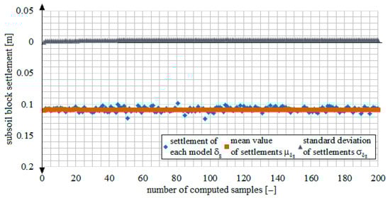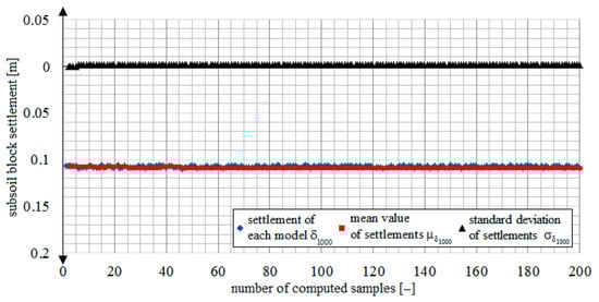 The computations are performed for 200 generated foundation models. To assess solution convergence, parameter variation is examined on the central point settlement of the foundation, neglecting the boundary condition impact (Figure 15). Based on the computations, variable settlement shows its mean value and standard deviation .