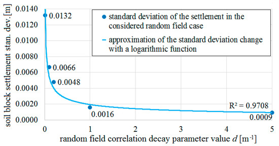 The computational results (Table 1) can be summarized as a closed-form relation between the correlation decay parameter and standard deviation variability of the analysed settlement. The logarithmic approximation is shown in Figure 5. As the settlement mean value remains at a specified level throughout the computations of distinct sets (Table 1), it is not considered here.