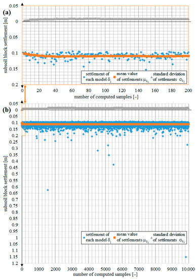The first stage of the analysis checks the convergence of the investigated displacement with 200 FE models computed for different random variable generations. The mean value and standard deviation are obtained here. In the second stage, the test was expanded to a total of 10,000 samples, bringing a sample mean and standard deviation . The computed displacement of each FE model (sample) and convergence of both mean value and standard deviation of the settlement are shown in Figure 6. The 200-sample test is separated in Figure 6a, and the complete 10,000-sample test is presented in Figure 6b.