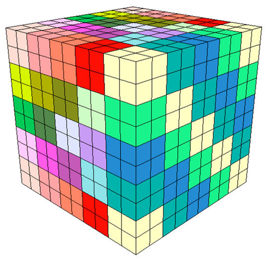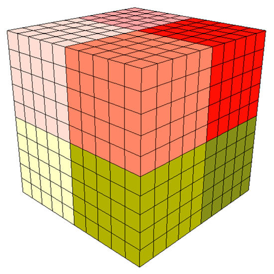 To further refine the analysis, another subdivision of the analysed subsoil block is introduced. Here, the 1000-element block is divided into 125 equal sub-blocks (Figure 9), each consisting of elements. This means an input of different Young’s moduli into the global FE model ().