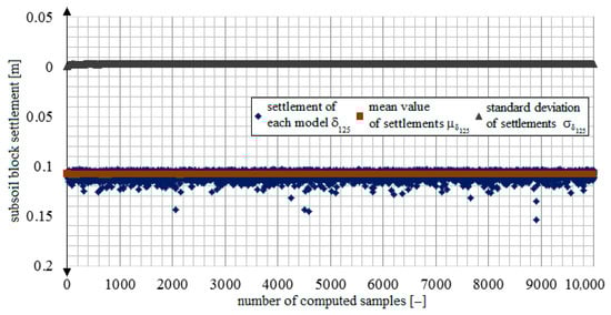 The 10,000-sample mean does not substantially differ from the 200-sample test, but the standard deviation does. The latter stems from excessive soil settlements reaching (the 9851st sample) which, in turn, is produced by extremely low Young’s moduli generated for the FE models. The highest settlement in the initial domain of 200 samples is (the 149th sample). The computed peaks exceed the settlement allowable for the ZSoil® nonlinear material model. The excessive cases should be analysed separately in terms of the large displacement theory. It should be stated that the single random variable solution (Young’s modulus) for all finite elements is wrong.
