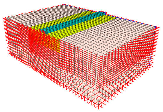 The advanced computational three-dimensional FE model of a perfectly continuous foundation resting on a three-dimensional random subsoil verifies the prior FE solution of a subsoil block. A sufficiently long segment of the foundation is analysed to provide numerical results of a displacement of the central node of the foundation longitudinal cross-section free of any interference of the boundary elements. The considered FE model of a segment of the strip footing foundation of dimensions , resting on a spatially random subsoil, is presented in Figure 14. A volume of is generated in the ZSoil® software, and the outer elements are properly constrained to accurately reflect the mechanical response of the entire subsoil under the foundation. The subsoil under the foundation level is only modelled, and the soil layers lying above the foundation–subsoil interface are replaced by a uniformly distributed load situated on the upper surface of the subsoil FE model. The dead load of the foundation wall is represented by a linear load per FE length. The wall-foundation connection makes the deflections compatible; the rotations do not follow the rule.