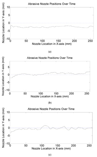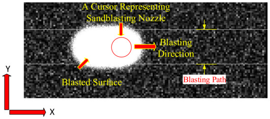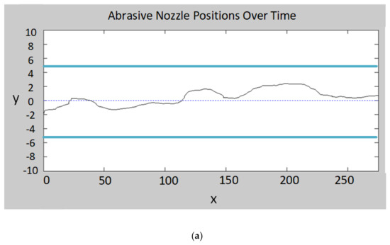 To employ Equations (1) and (2), we assume that the cleaning surface is rectangular. The target is a straight line along the horizontal axis (X-axis), as shown in Figure 2, and the system output is the position of the abrasive nozzle. Our variation refers to the deviation in the abrasive nozzle position on the Y-axis.