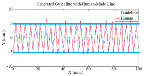 Consider the position (solid lines) obtained from three participants performing the task using the conventional approach as shown in Figure 3. The dotted lines in the center of the figures are the target positions. Because the operator is allowed to move freely within the path, it can be seen that the variations in Figure 3a–c are the different combinations of lack of accuracy and lack of precision, which are difficult to predict. Therefore, any given movement must be specified in advance.