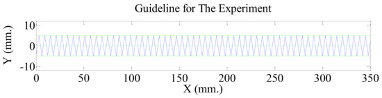 The guideline for training was designed to have an amplitude, H, of 10 mm; the wavelength, W, was 6 mm. The amplitude and wavelength were each set according to the numbers obtained from our preliminary experiment in order to find values that our participants were comfortable with in terms of the movements of their wrists and fingers during the operation. The guideline is shown in Figure 7.