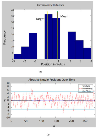 where y 1 t is the state vector containing the abrasive nozzle position at time t; D t is the state transition matrix that applies the effect of the system state parameter(s) at time t − 1 on the system state at time t; E t is the control input matrix that applies the effect of the control input parameter(s) in the vector s t on the state vector; w 1 t is the vector containing the process disturbance or noise terms for the parameter(s) in the state vector; z 1 t is the measurement vector; C 1 t is a matrix that transforms the state vector y t into the measurement unit; and m 1 t is the vector containing the measurement noise terms for observation(s) in the measurement vector.