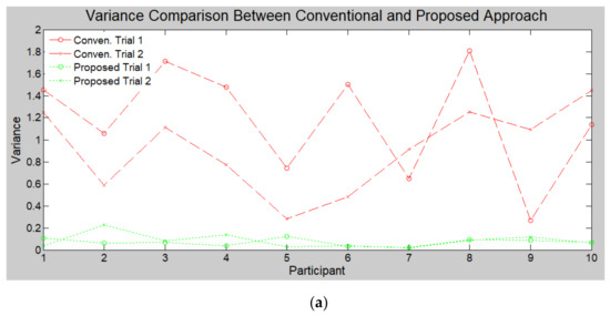 To assess the participants’ ability to imitate the guideline of the proposed arm movement pattern, we observed the MSE before filtering ( C o v z k ). The average of the MSE from all the participants was 6.9329, whereas the guideline had an MSE of 8.3240. The difference between those MSEs is approximately 16.7%. This number indicates that despite being well trained, each participant created the pattern in accord with his or her preferred amplitude. Most of the participants preferred a lower amplitude than the guideline amplitude, as shown in a plot of individual variance in Figure 9a. However, a paired t-test suggested that the amplitudes from participants significantly differed in regard to the distance that each could cover with wrist-and-finger movement. Our finding supports the results reported in [33], according to which it is difficult for an operator to accurately move his or her hand to a desired position without the aid of visual information.