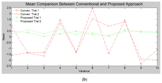 Figure 9. Plot comparisons of the (a) variance and (b) mean between the conventional approach and the proposed approach.