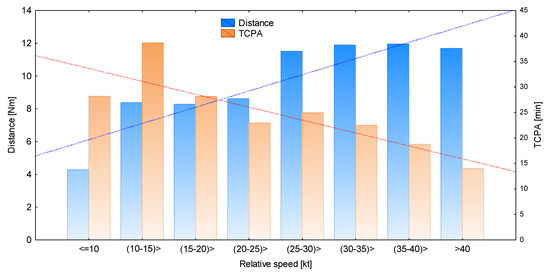 3.2.1. Influence of Relative Speed on the Distance between Ships and TCPA at the Start of the Manoeuvre