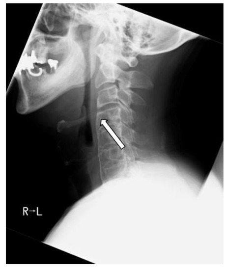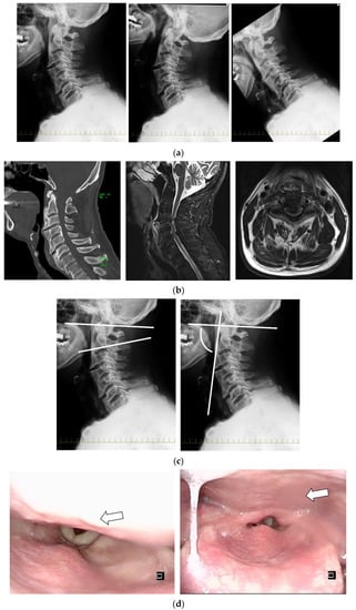 - Egerter, A.C.; Kim, E.S.; Lee, D.J.; Liu, J.J.; Cadena, G.; Panchal, R.R.; Kim, K.D. Dysphagia Secondary to Anterior Osteophytes of the Cervical Spine. Global Spine J. 2015, 5, 78–83. [Google Scholar] [CrossRef] [PubMed]