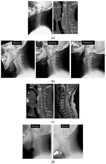 Case 1. (a) Functional cervical spine X-ray (figures from left to right show middle, extension, and flexion). (b) CT showed no fracture, and MRI showed compression of the cervical spinal cord due to thickening of the ligamentum flavum and suspected damage to the intervertebral disc and anterior longitudinal ligament. MRI showed stenosis at the level of the pharynx due to 16.3 mm OALL at C3/4 and spinal cord compression. (c) Figures from left to right show an O-C2 angle of 25° and a pharyngeal inlet angle (PIA) of 76°, and the S-line was negative. (d) The patient was immobilized in the middle position, and video endoscopy (VE) revealed protrusion of the pharynx due to ossification (arrow), but swallowing was normal.