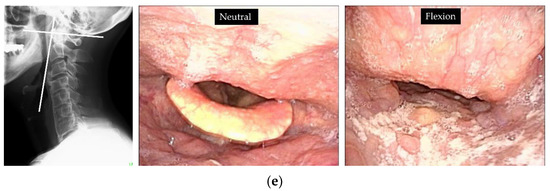 Radiological evaluation: the extent of ossification increased from 6.1 mm (Figure 4a) to 11.6 mm over 6 years at C3/4, and the shape was globular type. Intervertebral mobility was noted at C3/4, with a total of 3° of intervertebral mobility in C3/4 with 2° of kyphosis in retroflection and −1° of forwarding flexion. The O-C2 angle was 30°, the PIA angle was 80°, the S-line was negative, and the C2-7 angle was 12° (Figure 4b). Otorhinolaryngological findings: VE and VF demonstrated that the pharyngeal cavity was compressed and narrowed anteriorly due to ossification, which was further exacerbated by flexion of the cervical spine (Figure 4d).