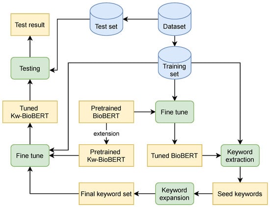 44]. The resulting Kw-BioBERT model is then fine-tuned on the training set, with the keywords injected into the model as external domain knowledge. The tuned Kw-BioBERT is evaluated on the test set to obtain the final result.