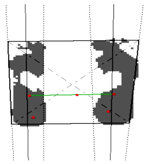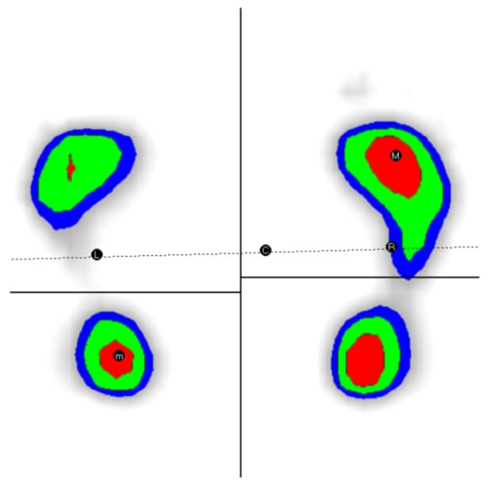 Understanding the differences between the values recorded for the dominant leg vs. the non-dominant one is made easier, due to the photos generated by the software for each case. The average values presented in the previous tables do not facilitate the formation of a complete image of the analyzed problem, and the selective presentation of the photographs for some of the measured parameters can be a source of complementary information. At the level of weight distribution L/R (percent or kg), the software values indicate a difference of maximum 3% between the load of the two feet, for that to be considered balanced (Figure 12). For 12 athletes this aspect is not confirmed (Figure 13), nine of them having an exaggerated load on the dominant/right leg (Figure 14), and 3three on the left (Figure 15), (seven cases for the group under 13 years old, four cases for those aged between 13–15 years, and only one case for the group over 15 years old), so we can conclude that experience and aging favorably regulate the weight distribution on the two feet.