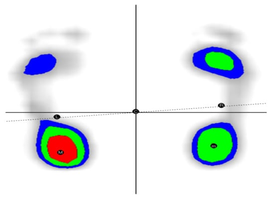 Standard reference values of plantar weight distribution for healthy adults in Germany (aged 18–65 years) are determined and analyzed by [20]. Load distribution on the left foot vs. the right foot is balanced, for all stages of age, without gender/sex differences. The distributed load is higher on the rearfoot area of the legs (55%) and lower on the forefoot area (45%). An increase in BMI (body mass index) generated an increase in pressure in all areas, and advancing in age led to the movement of the load/load to the front part of the foot/forefoot and to an increase of the maximum pressure in the left foot, the biggest differences being observed between young people (18–40 years) and older persons (41–65 years).