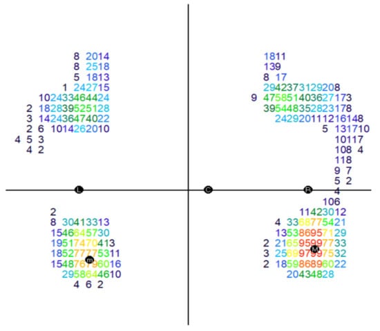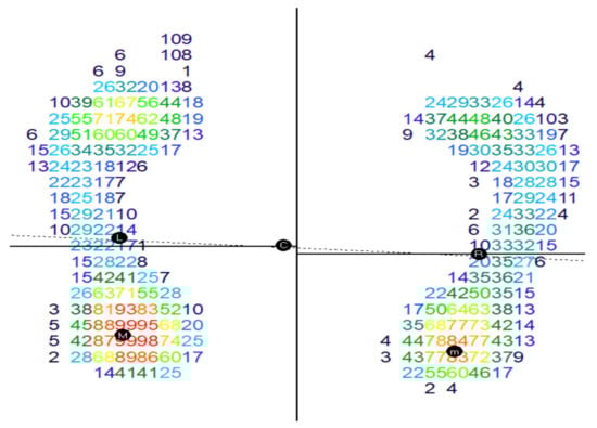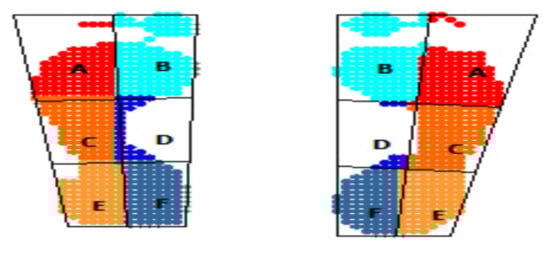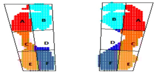 The values provided by the software for the interpretation of the symmetry of the total plantar surfaces (cm2) indicate in the group of those under 13 the most situations of relative symmetry/difference of surfaces of maximum 8 cm2 or of small differences (6 cases). For this aim, the area was divided into 6 sectors marked with the letters A-F (Figure 15). The group aged 13–15 years had the fewest cases (two), and half of the group of those over 15 years old (three cases) fall into these values, so with increasing age there is a higher incidence of those with asymmetries of plantar surfaces (Figure 16).