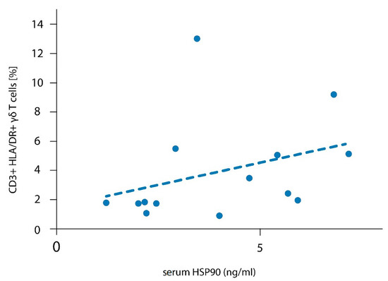 The same investigations also showed no statistically relevant differences among healthy controls (serum HSP90 and CD3+ γδ T cells R = 0.45; CD4+ γδ T cells R = 0.2; CD8+ γδ T cells R = 0.12).