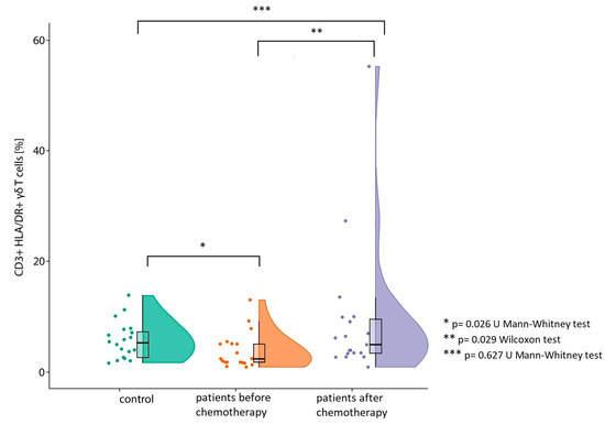 We found no statistical differences before and after chemotherapy (Wilcoxon signed-rank test) in the levels of CD3 + γδ T cells (p = 0.87), CD4 + γδ T cells (p = 0.57), and CD8 + γδ T cells (p = 0.39) (Table 3).