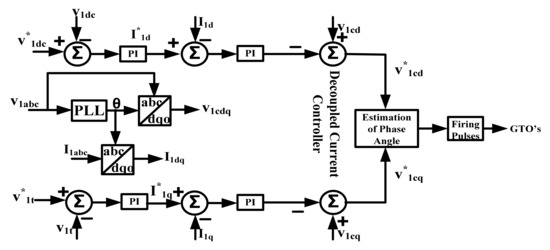 This DC-Link Voltage controller provides the direct axis reference current ‘’ by keeping the constant DC Voltage ‘’ with the reference DC Voltage ‘’. The DC-Link Voltage controller is responsible for maintaining the constant DC Voltage ‘’ at the reference DC Voltage ‘’. The proportional-integral (PI) controller is used for this purpose. The output of the PI controller accounts for the losses in the STATCOM, and it is considered to be the real power component of the current ‘’. The real power component of the current ‘’ is fed to to the decoupled controller. The DC-Link voltage controller maintains the DC-link voltage at the reference value using a small amount of active power transfer between the AC system and the DC–DC-Link of STATCOM. The low value active power flows to DC side to hold DC reference voltage, as expressed by Equation (8):