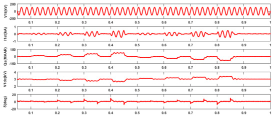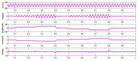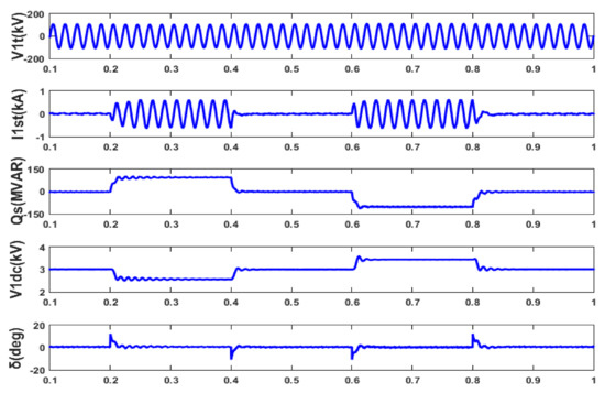 Figure 7 shows that the starting nominal reactive power value is 0, and time reaches to 0.1 s. From 0.1 s, the variation of reference reactive power is moved to 20 MVAR, and the actual reactive power () flows in the system without any major overshoots until 0.15 s. The DC-Link voltage will start to decrease. Thus, the AC converter output voltage starts to decrease, then STATCOM will absorb the reactive power () and, again, maintain the nominal reactive power value (i.e., 0) from 0.15 s to 0.2 s. The disintegration inductive load reactive power 40 MVAR is added at 0.20 s, and the actual reactive power () flows in the system without any major overshoots until 0.25 s. Again, STATCOM will absorb the reactive power (), and maintain the nominal reactive power value of 0 from 0.25 s to 0.3 s.