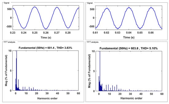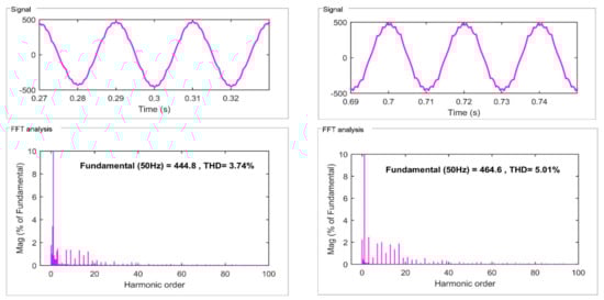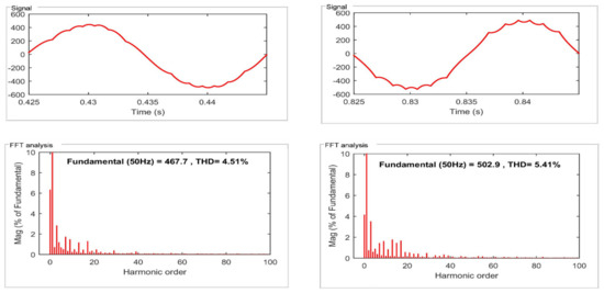 Figure 3 shows the performance results of the STATCOM at various dynamic conditions of continuous load. Initially, the reactive power variation was set to ‘0’ for 0.2 s and the performance was observed. Then, the reference reactive power is varied from 0 to 100 MVAR and the time interval is between 0.2 s and 0.4 s. The STATCOM performance was observed during this time period and the reactive power flows to the STATCOM side, then the AC output voltage and DC-Link voltage were adopted to the voltage losses. After the reactive power is set to ‘0’ during the time interval 0.4 s to 0.6 s, STATCOM performance results were analyzed during the time interval from 0.4 s to 06 s by presetting the reactive power to ‘0′. The reference reactive power was varied from 0 to −100 MVAR for the time interval between 0.6 s and 0.8 s. The STATCOM performance was observed during this time period and the reactive power flowed from the STATCOM side; then, the AC output voltage and DC-Link voltage are added to the voltage losses. After the reactive power was set to ‘0’ during the time interval 0.8 s to 1.0 s, the STATCOM performance results were given, showing the improvement of the smooth steady-state system with low harmonic distortion.