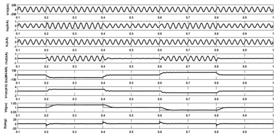 Figure 5 shows that the nominal reactive power value starts at 0 and time reaches to 0.1 s. The reference reactive power variation is moved to 35 MVAR within 0.15 s (i.e., 0.1 s to 0.25 s). Again, the cumulative reactive power 40 MVAR is added at 0.25 s, then the actual reactive power () flows in the system without any major overshoots until 0.4 s. Now, the total cumulative inductive load () is set to 75 MVAR, then the DC-Link voltage starts to decrease. Thus, the AC converter output voltage starts to decrease, then STATCOM will absorb the reactive power () and, again, maintain the nominal reactive power value of 0 within 0.1 s, (i.e., 0.4 s to 0.5 s). The capacitive load starts at the time 0.5 s in the system with the reference reactive power moved to −35 MVAR and the time reaches 0.65 s. Again, the cumulative reactive power 40 MVAR is added at 0.65 s, then the actual reactive power () flows in the system without any major overshoots until 0.8 s. Now, the total cumulative capacitive load () is set to −75 MVAR, then the DC-Link voltage will start to increase. Thus, the AC converter output voltage starts to increase, then STATCOM will deliver the reactive power () and, again, maintain the nominal reactive power value of 0 from 0.8 s to 0.9 s.