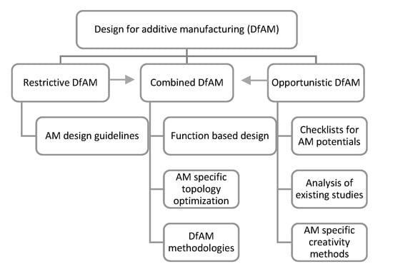 As for any other manufacturing method, design guidelines have to be followed for a qualitative and economic fabrication of the designed part. The established methods of design for manufacturing (DfM) aim for design solutions with minimum manufacturing costs for a given manufacturing technology. Even though such guidelines for favorable manufacturing are still an elementary part of a design for additive manufacturing (DfAM), these methods shall further support the exploration of AM-enabled potentials and possibilities. Laverne et al. propose to differentiate opportunistic DfAM, restrictive DfAM, and dual DfAM [10]. Opportunistic DfAM methods shall enable the designer to explore innovative solutions enabled by the possible geometric complexity of AM products. The solution space of such methods is not narrowed by the limitations of the AM technology as in the definition of conventional DfM. These limitations are covered in the class of restrictive DfAM methods. In these, design rules are defined, that guide the designer to create a part with sufficient manufacturing quality. The majority of such design rules are developed in university research through test series [11,12,13,14]. These restrictions can be quantified as for minimum radii or wall thicknesses, as well as general guidelines for a sufficient manufacturing result [14]. They are more and more transferred into official design guidelines [15] and textbooks [4]. Finally, methods utilizing a combination of both, restrictive and opportunistic DfAM, are considered to be the most efficient for a holistic product design manufactured by AM technologies. With these, innovative concepts are designed for a qualitative manufacturing outcome [5]. Therefore, for each classification, different tools as depicted in Figure 1 are suggested.