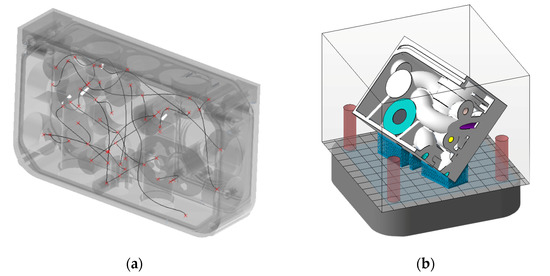 Following, the embodied design steps eight to eleven are executed as proposed in Figure 2. As depicted in Figure 6a, hydraulic channels are designed based on spline curves, with a special focus on conformal positioning onto existing features, a homogenous channel cross-section, and large radii for flow efficiency. Through the freedom in channel design, the integration of the hydraulic layout into the defined boundary conditions implicates little difficulties. The unfinished geometry of installation spaces is designed as uniform, cylindrical geometry, with a machining offset of at least 1 mm.