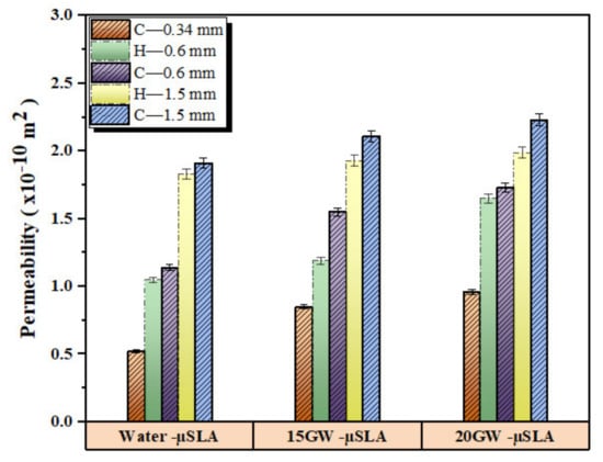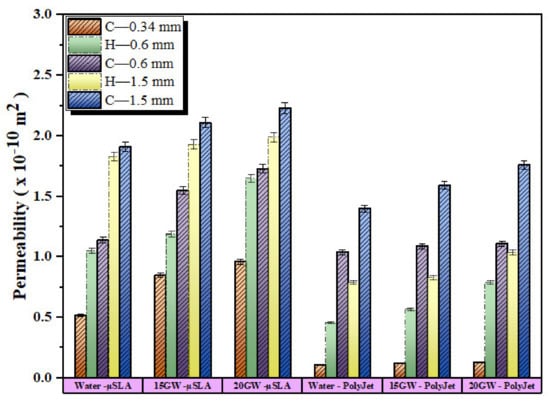 | Permeability (×10−10 m2) | PolyJet | µSLA | ||