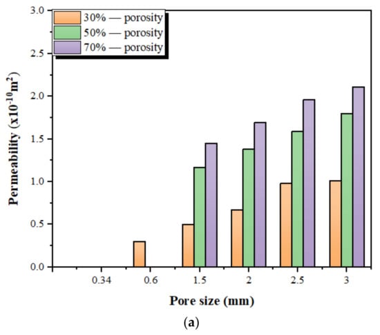 Equation (3) showed that specific surface area was an important parameter that affected the permeability and changed with every scaffold structure; therefore, it was also important to observe the effects of the pore size and porosity of scaffold structures on the specific surface area, which ultimately affects the permeability. The surface area decreased with increases in pore size [45]. Figure 6 also shows the same results, i.e., the specific surface area decreases with increases in pore size and porosity. The lower pore sizes plotted in this figure were 0.34 mm and 0.6 mm and then 1.5 mm, 2.0 mm, 2.5 mm, and 3.0 mm; therefore, this drastic change in the surface area may also have been due to the difference in steps between 0.6 mm and 1.5 mm. Moreover, Equation (3) also represents the inverse relation between the porosity and surface area; hence, the increase in pore size decreased the specific surface area and resulted in increased permeability.