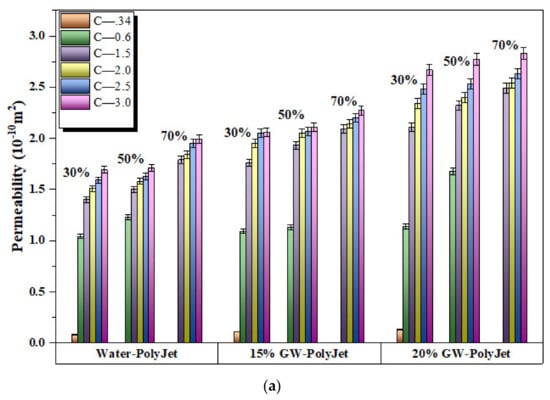 Table 4 shows that the experimentally measured permeability was higher than the numerically calculated permeability for all cases. The variation between the measured and calculated permeability values could be due to the poor cleaning of 3D-printed scaffold structures or due to the parameters that were not included in the Kozeny–Carman equation, such as pressure drop across the sample, fluid viscosity, and surface energy; therefore, a combined model with the benefits of both experimental and calculated methods could be beneficial for measuring permeability more accurately.