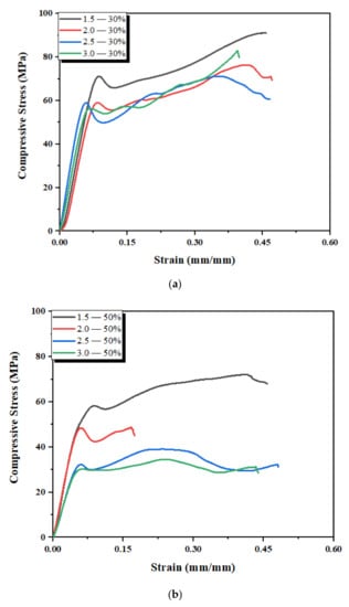 In this study, the mechanical properties of 3D-printed scaffold structures were investigated experimentally. In total, twenty-eight samples were used, and in order to determine the 95% confidence level, three repetitions of the compression test were performed for each sample; therefore, eighty-four samples (three copies of each sample) were printed to perform the compression tests. Figure 10 illustrates the stress–strain curves of the PolyJet 3D-printed scaffold structures in the uniaxial direction for different porosity levels and different pore sizes.