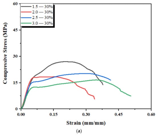 Stress–strain curves of PolyJet 3D-printed scaffold structures with a cubic pore shape at (a) 30%, (b) 50%, and (c) 70% with 1.5 mm, 2.0 mm, 2.5 mm, and 3.0 mm pore sizes.