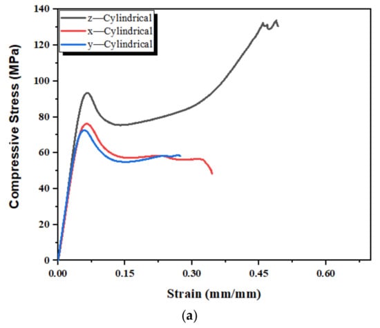 Stress–strain curves of 3D-printed standard samples in the x-, y-, and z-directions. (a) Standard sample with cylindrical cross-section; (b) Standard sample with rectangular cross-section.