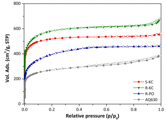 The activation protocols applied for both lignocellulosic materials yielded highly porous activated carbons with specific surface areas ranging between 1500 and 2200 m2/g (Table 2, [19]). The N2 adsorption/desorption isotherms at −196 °C of the four activated carbons are presented in Figure 1. All of them correspond to a Type I isotherm according to the IUPAC classification [27], which is characteristic of mainly microporous materials.