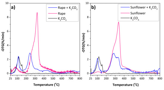 DTG curves obtained from 25 to 800 °C (10 °C/min) under Ar atmosphere of (a) raw rape and rape impregnated with K2CO3, and (b) raw sunflower and sunflower impregnated with K2CO3. The profile of K2CO3 is included for comparison.