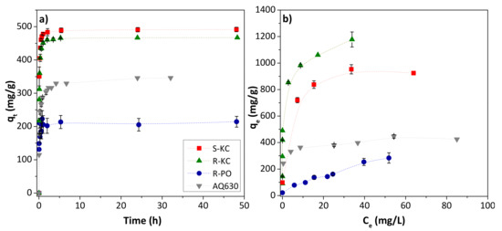 Figure 3a shows the adsorption kinetics of MET for the four adsorbents. As we observed in our previous studies [19], in all cases, an increase in the adsorption time implies a fast increase in the removal of MET before equilibrium was reached (ca. 3–4 h). However, the amount adsorbed in equilibrium conditions was very different for each adsorbent, with the highest adsorption for the S-KC material, followed by R-KC, AQ630 (the commercial activated carbon) and R-PO. The greater adsorption of carbonate activated carbons, R-KC and S-KC, (as it was already reported [19]) is mainly associated with their larger surface area, higher than 2000 m2/g (Table 2). The experimental data were well-fitted to the pseudo-second order model (correlation coefficients between 0.979–0.999) showing a calculated qe values closed to those experimentally obtained (Table 3). The highest value of the rate constant, k2, was obtained for the adsorption on R-PO, while AQ630 showed the slowest adsorption.