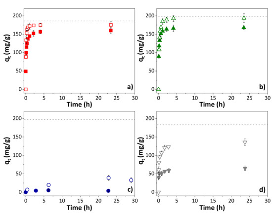 Influence of the solution pH (closed symbols for natural pH and opened symbols for pH 2) on the adsorption of OXA on (a) S-KC, (b) R-KC, (c) R-PO and (d) AQ630 (0.2 g OXA/g adsorbent). The dashed line corresponds to the saturation. The error bars represent the standard deviation.