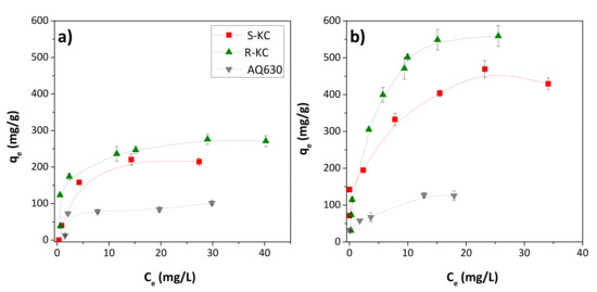 The MET adsorption isotherms were realized for a contact duration of 3 h. Figure 3b reveals the following trend of adsorption capacity values: R-KC > S-KC > AQ630 > R-PO. The experimental isotherms were fitted to the Langmuir and Freundlich models (Table 3), showing the best adequateness to the Freundlich equation. Despite the different chemical composition of the adsorbents (Table 2), the variation of the adsorption capacity is mainly associated with the textural parameters, since the electrostatic interactions are discarded due to the non-polar character of MET [17,19]. Accordingly, the highest value (above 1000 mg/g) was observed for the material with the greater SBET and higher mesoporous development (R-KC); in contrast, the lowest adsorption capacities (ca. 280 and 435 mg/g for R-PO and AQ630, respectively) were obtained for the samples with lower surface area. The acidic character of the R-PO sample also showed an important effect, it being the adsorbent with the lowest adsorption capacity, probably associated with the adsorption competition with water molecules.