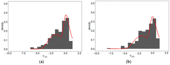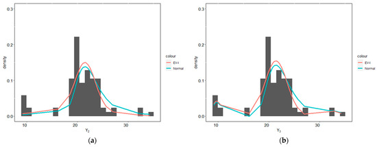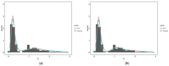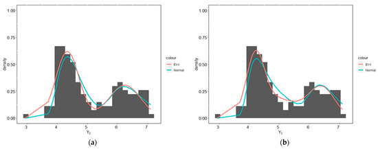 We used the EV-I mixture and Gaussian mixture distributions to analyze the data described above. We used the same hyperparameters as in the simulation study section because the double-exponential and logistic distributions both have location and scale parameters. To compare the performance between the EV-I mixture and Gaussian mixture distributions, we used the Kullback–Leibler divergence; a complete explanation and formula for the Kullback–Leibler divergence (KLD) can be found in Van Erven and Harremos [73]. In the simple case, the KLD value of 0 indicates that the true values with fitted densities have identical quantities of information. Thus, the smaller the KLD value, the more identical the true and fitted densities are.