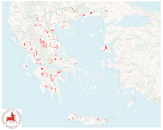 Locations of 444 small ruminant farms around Greece that were visited for bulk-tank milk sampling.