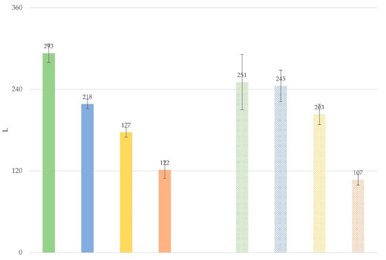 Average yearly milk production per animal in sheep (solid pattern) or goat (motif pattern) farms in Greece, applying the intensive (green), semi-intensive (blue), semi-extensive (yellow) or extensive (red) management system.