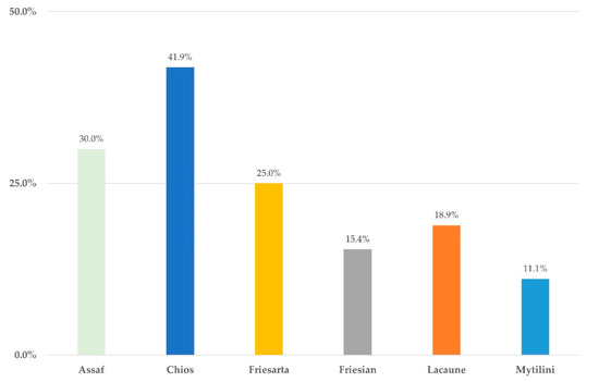 In contrast, there was a low proportion of farms with animals of the Mytilini-breed that had increased SCC in bulk-tank milk. Future studies could be based on breed as a potential model for mastitis resistance among Greek breeds. Unfortunately, however, the breed is native to the island of Lesvos, where bluetongue is endemic [38] and, consequently, the Ministry of Agriculture has imposed a total ban on animal movements outside that island.