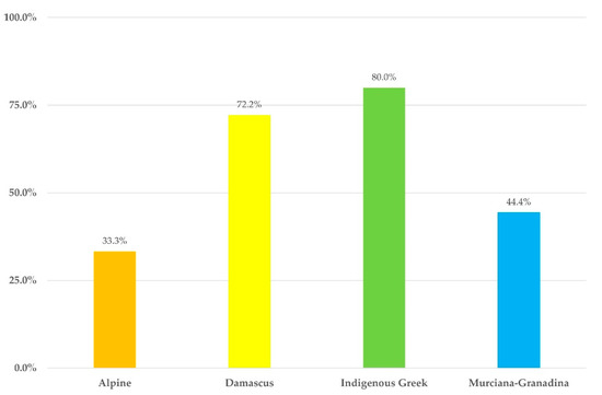 Proportion of herds with increased somatic cell counts (>0.75 × 106 cells mL−1) in the bulk-tank milk of goat herds in Greece in accordance with the breed of goats therein.