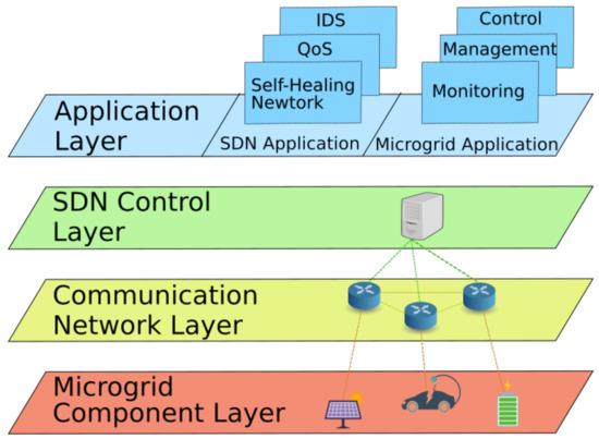 SDN allows verifying the entire communication network concerning security policies (e.g., access control) and network situations (e.g., loop-freedom and congestion-freedom). SDN allows also directly implementing a Network Intrusion Detection System (NIDS) within the SDN controller, even if such implementation may introduce a latency time that could be incompatible with the allowed latency in a microgrid environment [30]. The application of the SDN paradigm in microgrids may comprehend both security and control applications, as shown in Figure 1.