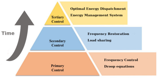 As already discussed, microgrids can operate in grid-connected or islanded modes. If the microgrid works in the grid-connected mode, the generators inject power by following economical logics, while the frequency and voltage are kept in the correct range by the main electrical grid. On the contrary, if it operates in islanded mode; the generators have to guarantee voltage and frequency regulation. The control of the electrical grid is usually schematized into three levels, as shown in Figure 2: