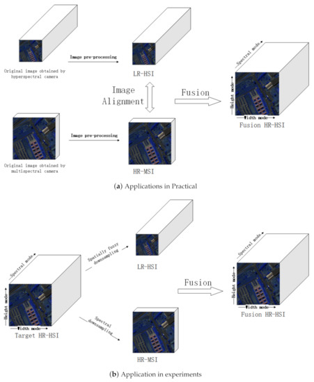 In the practical application of the fusion method, two images of the same area obtained by the hyperspectral camera and the multispectral camera can be pre-processed by image alignment [7] and enhancement. Then, the feature points in the two images can be extracted and matched separately, and then the two images can be geometrically aligned. After alignment, the two images can be used as input images for the fusion algorithm. The application flow chart is shown in Figure 1a. However, in this paper, in order to compare the fusion ability of various algorithms more effectively, we use the original image in the dataset as the target HR-HSI in the experimental part, simulate the LR-HSI obtained by the hyperspectral camera by spatially blurred downsampling of the target HR-HSI, and simulate the HR-MSI obtained by the multispectral camera by spectral downsampling of the target HR-HSI. The LR-HSI and HR-MSI involved in the fusion are already aligned images, so that we can easily check the fusion performance of the fusion algorithm by comparing the similarity between the fused images and the target image (the better the similarity, the better the fusion effect). The application flow chart is shown in Figure 1b.