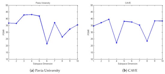 For our proposed method FSF, only one parameter is to be adjusted, the dimensionality of spectral bases q. When extracting spectral bases by SVD on LR-HSI, the dimensionality of spectral bases will affect the fusion results. Usually, the spectral bases exist in a small subspace, and we vary the dimension of the spectral bases from 1 to 10 to find the most suitable number of spectral bases. Figure 2a shows the PSNR values of the fused images when the number of spectral bases is varied from 1 to 10 in the Pavia University dataset, and it can be seen that the best fusion results are obtained when the dimension of spectral bases is 4. In Figure 2b, corresponding to the results on the CAVE dataset, it is clear that the best results are obtained when the spectral basis dimension is 3. The other methods used for comparison, CSTF https://github.com/renweidian/CSTF, Hysure https://github.com/alfaiate/HySure, LTTR https://github.com/renweidian/LTTR, NLSTF https://github.com/renweidian/NLSTF, STEREO https://sites.google.com/site/harikanats/, and NSSR http://see.xidian.edu.cn/faculty/wsdong, adjusted the parameters that affect their fusion results to achieve the best fusion results. The best parameters after tuning corresponding to these methods are shown in Table 1 and Table 2.